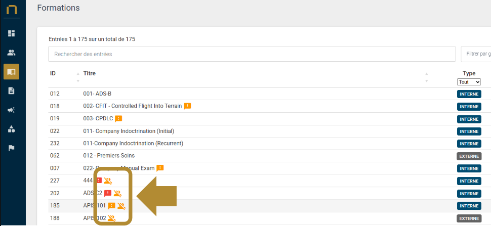 - AMÉLIORATION Du côté superviseur, dans la page de détails de l'utilisateur, la liste des formations à compléter indique désormais si une formation est désactivée ou n'a pas de contenu, permettant de savoir directement si l'utilisateur a présentement accès à la formation ou pas.